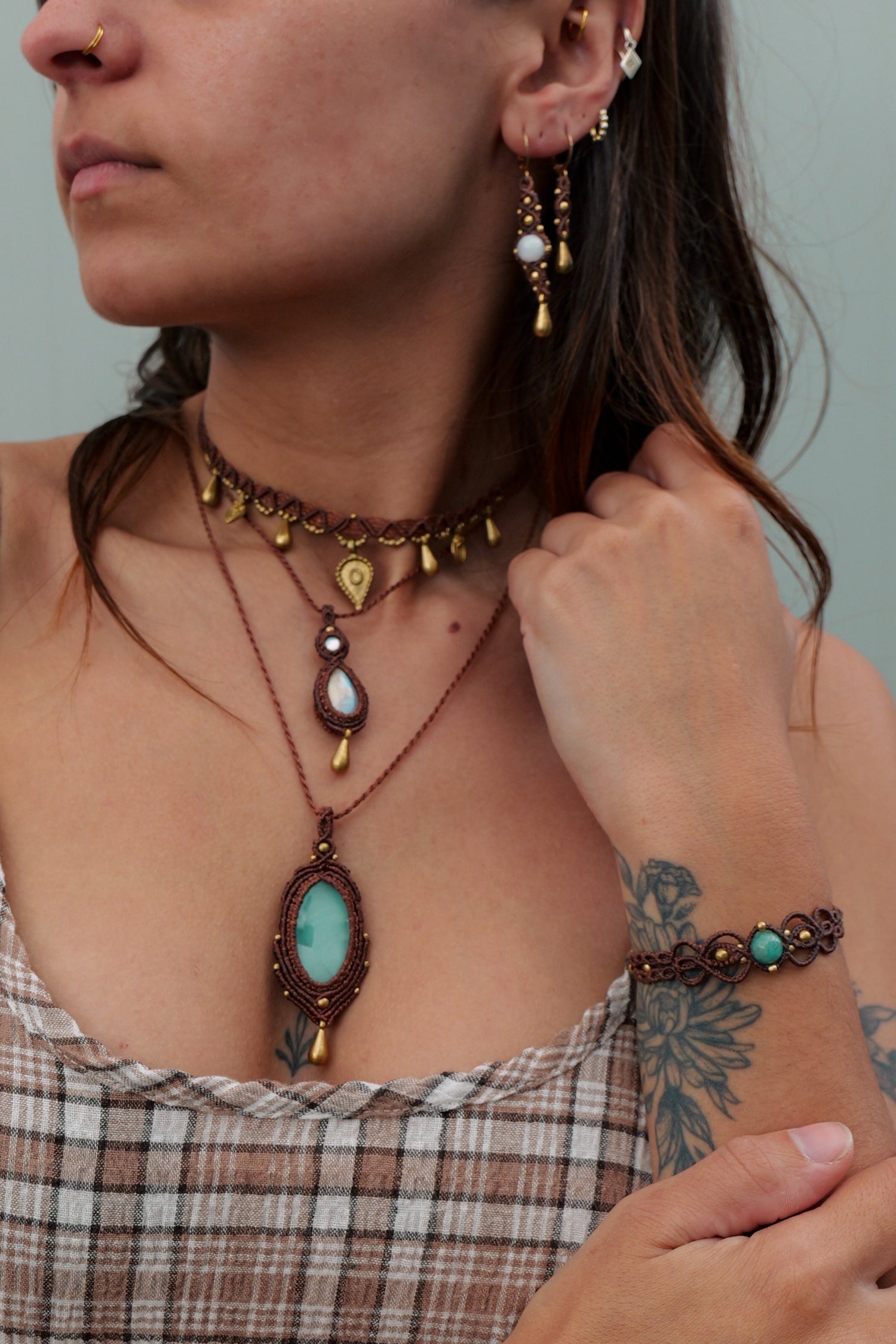 Macramé, crystal, and brass woven into pendants, chokers, bracelets, anklets, and earrings.